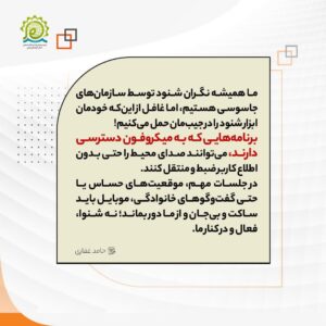 ما همیشه نگران شنود توسط سازمانهای جاسوسی هستیم، اما غافل از اینکه خودمان ابزار شنود را در جیبمان حمل میکنیم! برنامههایی که به میکروفون دسترسی دارند، میتوانند صدای محیط را حتی بدون اطلاع کاربر ضبط و منتقل کنند. در جلسات مهم، موقعیتهای حساس یا حتی گفتوگوهای خانوادگی، موبایل باید ساکت و بیجان و از ما دور بماند؛ نه شنوا، فعال و در کنار ما