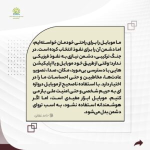 ما موبایل را برای راحتی خودمان خواستهایم، اما دشمن آن را برای نفوذ انتخاب کرده است. در جنگ ترکیبی، دشمن نیازی به نفوذ فیزیکی ندارد؛ وقتی از طریق خود موبایل و یا اپلیکیشنهایی با دسترسی بیمورد، مکان، صدا، تصویر، عادتها، مخاطبین و حتی احساسات ما را در اختیار دارد. با استفاده ناصحیح از موبایل دروازهای به حریم شخصی و حتی امنیت ملی باز میکنیم. موبایل ابزار مفیدی است، اما اگر هوشمندانه استفاده نشود، به اسب تروای دشمن بدل میشود.