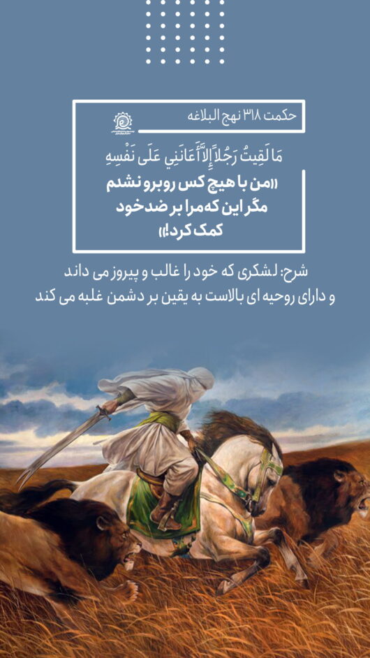 وَ قِيلَ لَهُ بِأَيِّ شَيْءٍ غَلَبْتَ الْأَقْرَانَ؟ فَقَالَ (علیه السلام): مَا لَقِيتُ رَجُلًا، إِلَّا أَعَانَنِي عَلَى نَفْسِهِ. «من با...